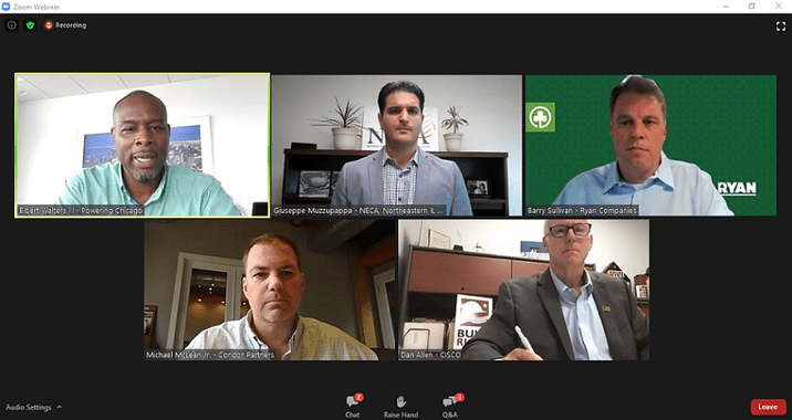 On July 30th, Giuseppe Muzzupappa, Assistant Chapter Manager of the Northeastern Illinois Chapter of NECA, moderated a panel discussion about the skilled labor shortage and the lack of interest in the trades as a career choice. Elbert Waters of Powering Chicago, Dan Allen of CISCO, Barry Sullivan of Ryan Companies and Michael McLean with Condor Partners were the panelists, adding great insight to the conversation. Executive Director Karyn Charvat delivered the welcome and brought greetings from PowerForward DuPage.